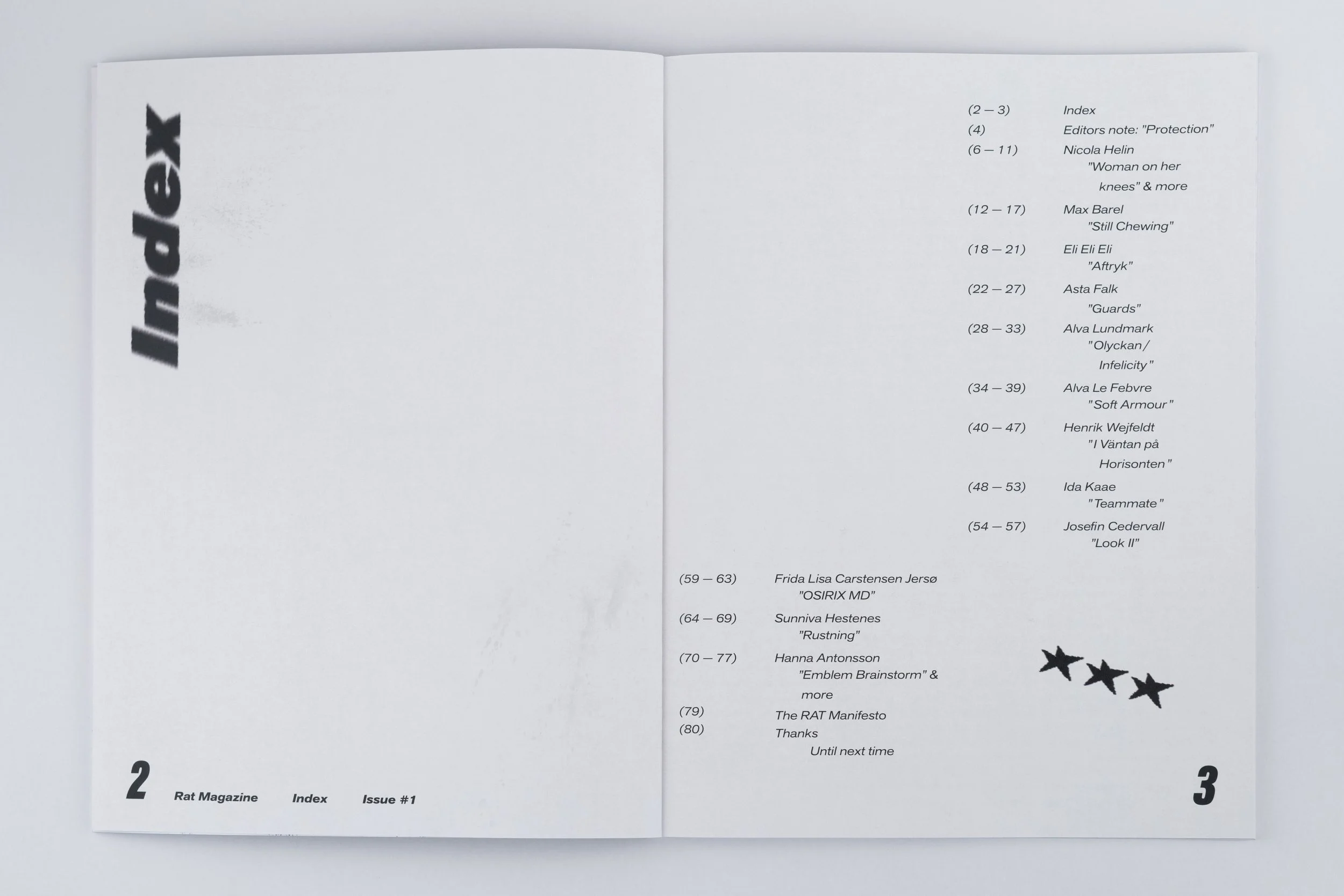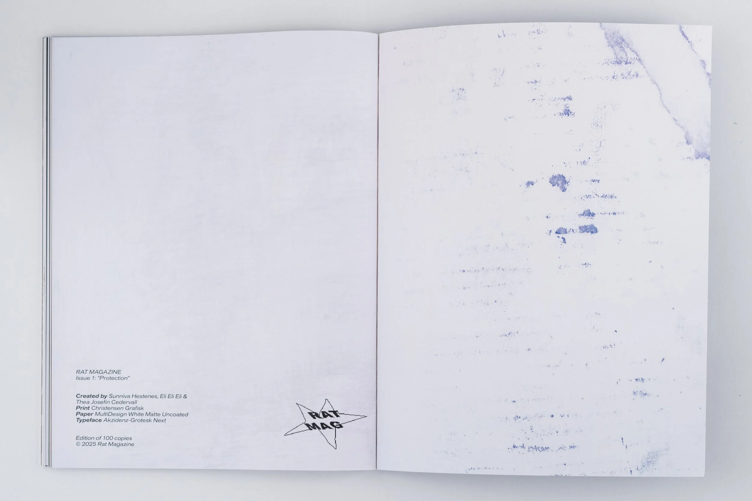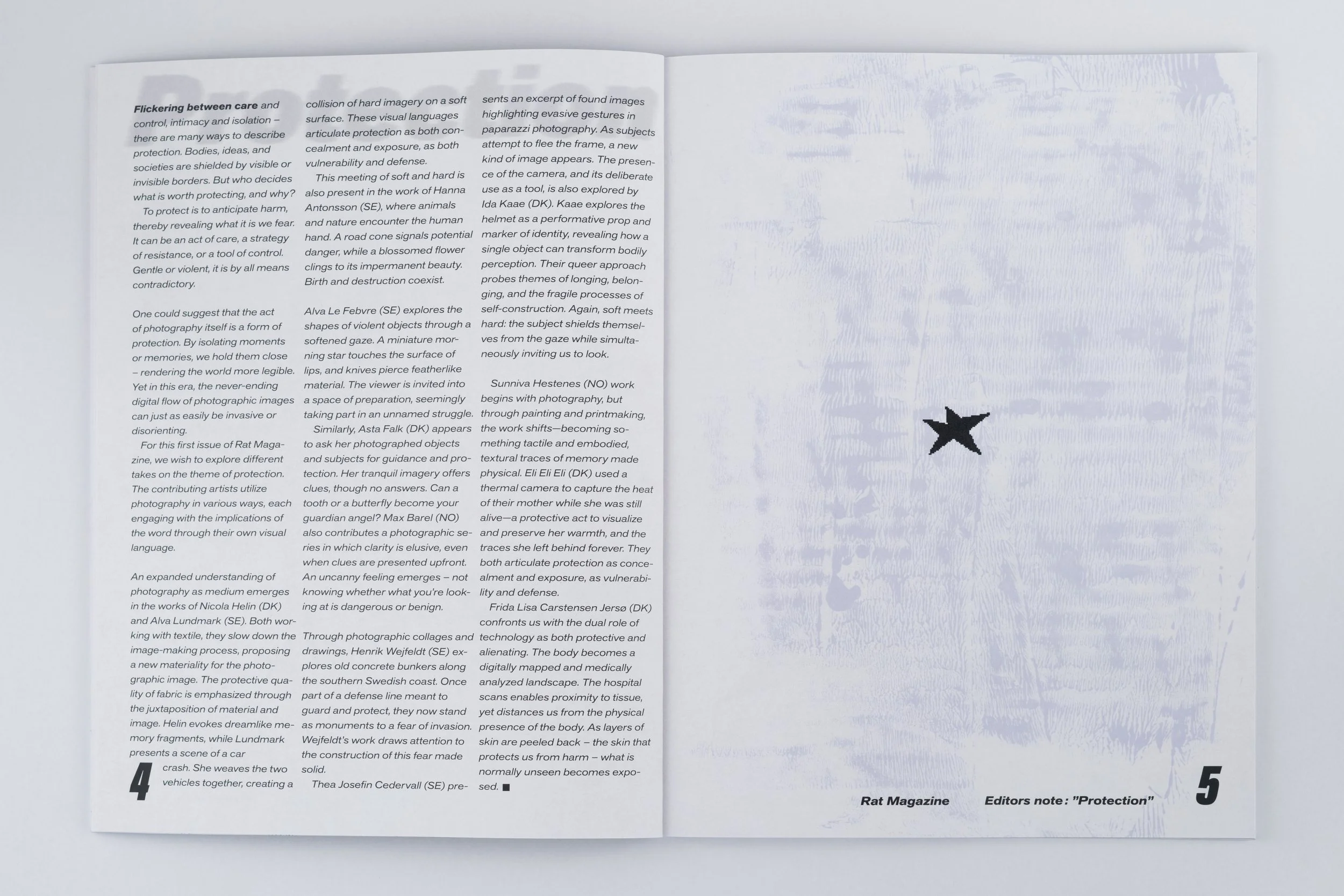 For this first issue of Rat Magazine, we wish to explore different takes on the theme of protection. The contributing artists utilize photography in various ways, each engaging with the implications of the word through their own visual language.
